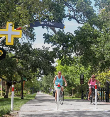 People riding bikes in Dunedin on the Pinellas Trail