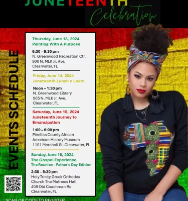 Jun 13, 2024 – Jun 16, 2024Join us for Clearwater’s 4-Day Juneteenth Celebrations brought to you by the Clearwater Urban Leadership Coalition & the City of Clearwater. This festival begins on Thursday, June 13th and concludes on Sunday, June 16th. Trust us, you don’t want to miss out on what we have planned this year. Click on this link to reserve your seat today.