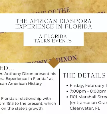 The Pinellas County African American History Museum will host Dr. Anthony Dixon and his talk "The African Diaspora Experience in Florida." Dr. Dixon will examine Florida’s relationship with its African descendants, from 1513 to the present day, and illustrate the direct impact they’ve had on the state’s growth.