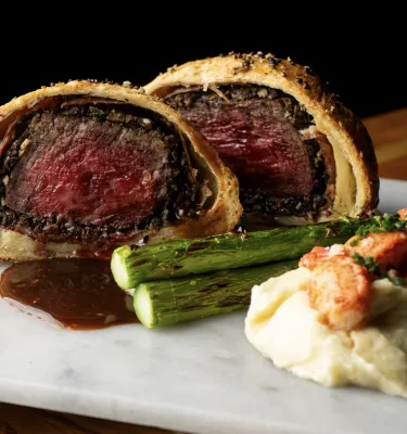 Elevate your meal with premium additions like Beef Wellington, available for preorder for $20, and $30 bottomless mimosas with mix and match flavors like watermelon & lime, cucumber & mint, mango & tajin, and the classic orange.