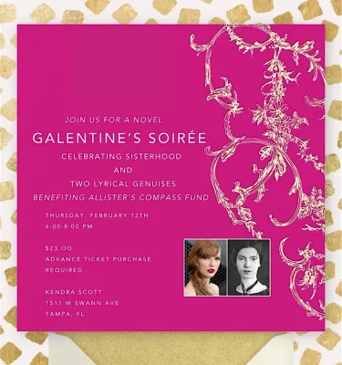 Galentine's Soirée benefiting Allister's Compass Fund, celebrating sisterhood and the lyrical geniuses of Taylor Swift & Emily Dickinson.