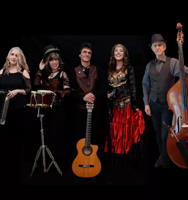 Gypsy Star is a gifted, musical collective of multi-instrumentalists performing original songs with layers of rhythmic texture, alluring, sultry vocals, lush harmonies and a mesmerizing, fiery dancer. This uniquely talented line-up is led by the captivating and creative spirit of composer, guitarist, singer Billy Keen and features the soul-stirring vocal prowess of lead singer, lyricist Belinda Brodsky who plays an array of hand percussion; world-class accordionist/keyboardist Joli Rome; the versatile stylings of Robert Strickland on upright and electric bass and dancer, Kimara Lee, who performs folkloric and gypsy-style dance creating another dimension to their live shows while also adding vocal harmonies and percussion to their sound. Gypsy Star’s show is truly a cultural feast for the eyes and ears!