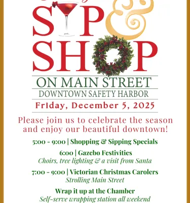Join the holiday celebration of the season at the annual Holiday Sip & Shop and enjoy beautiful downtown Safety Harbor!
