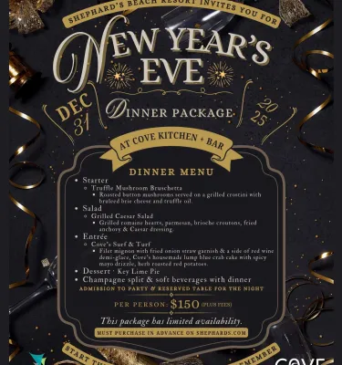 Ring in 2026 at the Cove Kitchen + Bar at Clearwater Beach! Featuring a 4-course dinner, surf & turf, a champagne toast at midnight, and front row viewing of the Clearwater Beach Fireworks.