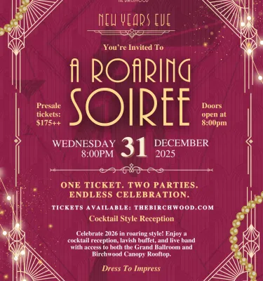 Step behind the velvet curtain and into The Birchwood’s New Year’s Eve Prohibition Party. Your all-access ticket unlocks both the Grand Ballroom and the Birchwood Canopy Rooftop for the ultimate Roaring 20s celebration. Enjoy a Cocktail-Style Reception, a Lavish Chef’s Buffet, and a Live Band ready to transport you straight into the Jazz Era.