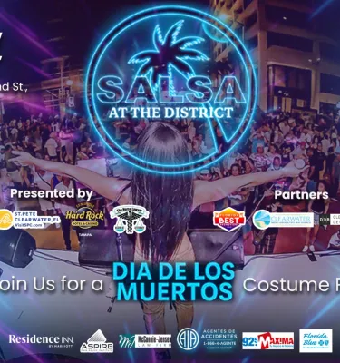 Join us for a spooktacular night of music, dance and vibrant culture at Salsa at the District: Día De Los Muertos costume party, in partnership with the city of Clearwater! We’re transforming The District into an unforgettable Latin Block Party filled with rhythm, color, and community.