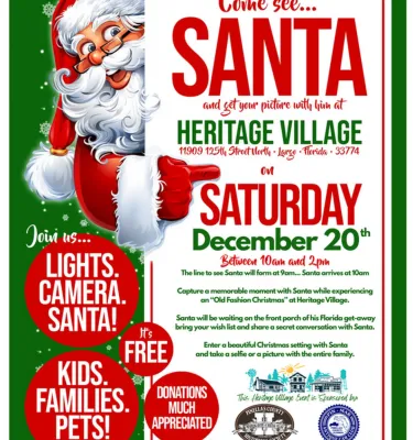 Santa will be at the McMullen-Coachman Log Cabin at Heritage Village for families to meet and take pictures. There will be food trucks, kids' activities, crafts, blacksmith demonstrations, and much more.
