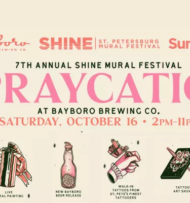 SHINE St. Petersburg Mural Festival kicks off 2 to 11 p.m. Oct. 16 at Bayboro Brewing with the release of “Spraycation,” a strawberry, orange, passionfruit ale brewed to support the St. Petersburg Arts Alliance’s award-winning mural festival.