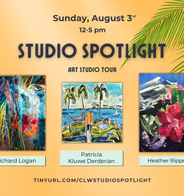 Join three artists for a Studio Spotlight Tour: An afternoon of art and fun. The event is hosted by Patricia Kluwe Derderian, Heather Rippert, and Richard Logan on Sunday, August 3rd, 2025 from 12-5 pm.