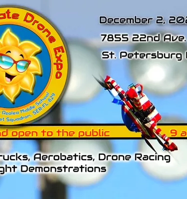 The Sunshine State Drone Expo, happening on December 2nd is a free event and open to the public. Drone Racing, RC Aerobatics, Flight Exhibitions from FHP and Southern Manatee Fire Department HAZMAT, and Duke Energy just to name a few. Get your TRUST Certification on the spot, Weather vs. Your Drone taught by Spectrum Bay News 9 Meteorologist Brian McClure, Industry displays from Raytheon, Motorola, FLYMOTION, Little Arms, Local AMA (Sparks Club) and much more. Food Trucks, and Drone Fun until 5:00pm.