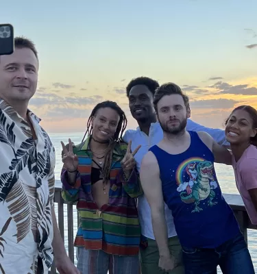 The cast members of Life's Rewards Season Two pose for a selfie with the gorgeous sunset at Pier 60 at Clearwater Beach.