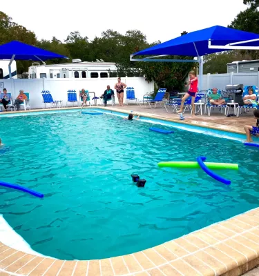Large pool at RV park with people playing in the water.