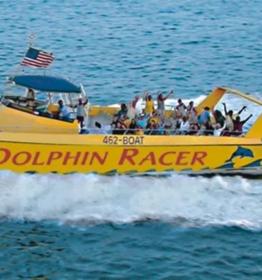 Take an exhilarating speedboat tour of the Gulf Beaches on the Dolphin Racer and watch as acrobatic bottlenose dolphin surf and dive alongside. This high-speed tour begins with a breathtaking race with nature; the speedboat creates a large wake, inviting the dolphin to jump and body surf nearby. Next, relax and take in the scenery as the tour finishes with a narrated inland cruise. It is sure to be an adventure that will be remembered for a lifetime. Don't forget a camera!
