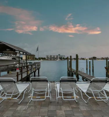 Waterfront view from the Enchanted Suites on the Bay with a boat and beach chairs overlooking the water.