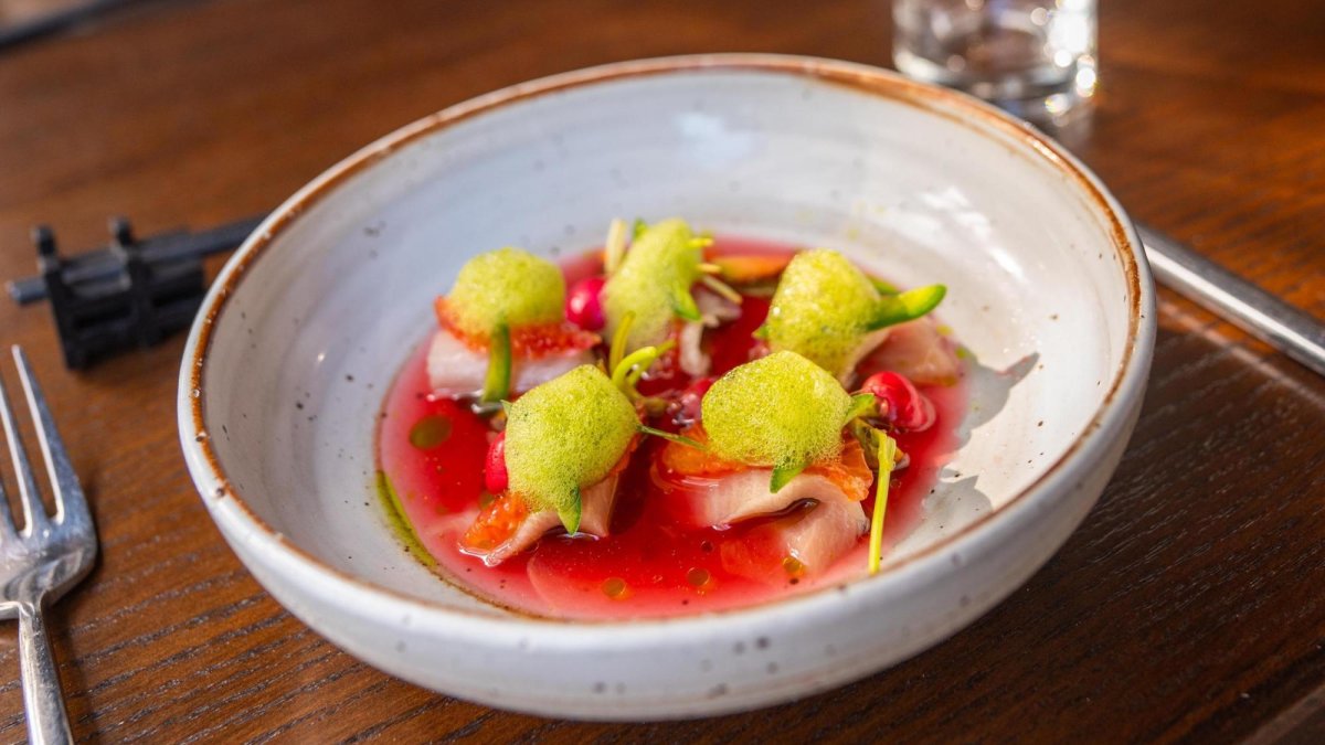 a white speckled bowl with raw fish garnished with a watermelon-colored sauce and something frothy and green