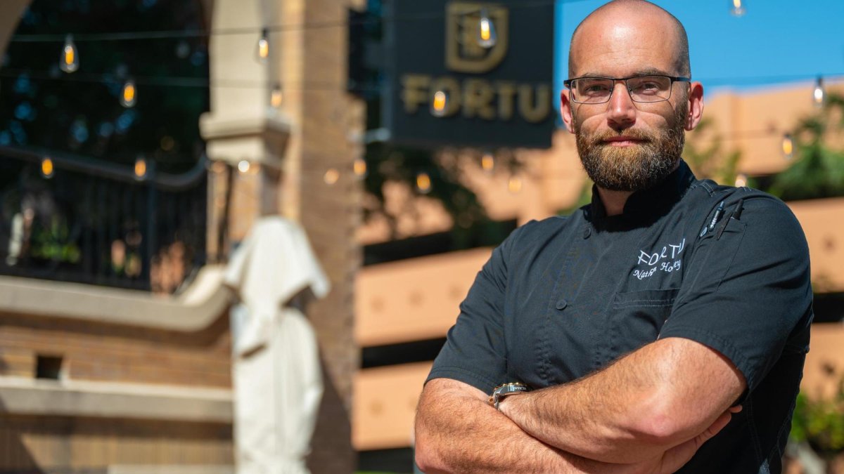 Chef Nathan Howie stands with his arms crossed outside Fortu restaurant, wearing a charcoal gray chef's jacket