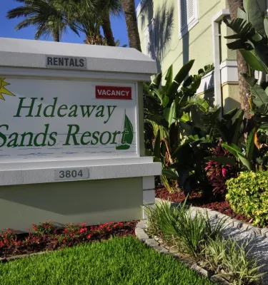 Sign with Hideaway Sands Resort surrounded by palm trees with a mint Green building in the background.