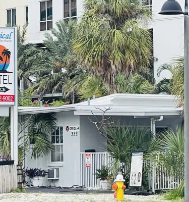 Street view of the Tropical Sky Ranch Motel with sign