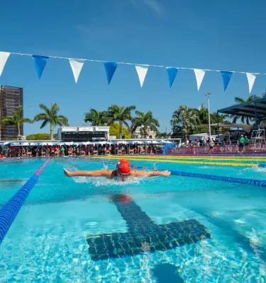 The North Shore Aquatic Complex is open year-round and offers a variety of pools for all ages and skill levels. The facility features a 50-meter main pool with a low dive, a 25-meter warm-up pool with zero-depth entry, and a play pool with flume slides and a splash pad. The complex is fully ADA accessible, making it a welcoming complex for everyone.