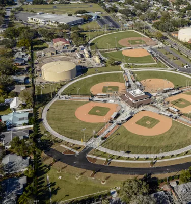Sid Lickton Ballfield Complex features seven lighted fields, including five baseball fields with grass infields and outfields and two softball fields with skinned infields. The complex includes batting cages, bullpens, and soft toss areas, along with a press box, bleacher seating for approximately 100 spectators per field, and enough parking for 240 vehicles.