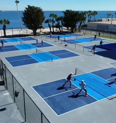 SouthSide Sports Complex at SkyBeach Resort features 12 pickleball courts, one tennis court, and four beach volleyball and beach tennis courts. The facility includes a pro shop, outdoor showers, restrooms, and the Salty Pelican food truck for on-site dining. Guests can also enjoy adjacent beach space with stunning views of the Sunshine Skyway Bridge.